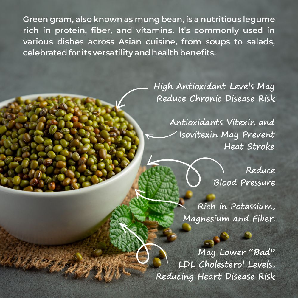 Green gram commonly referred to as mung bean.Green gram is highly nutritious and is a good source of protein, dietary fiber, vitamins, and minerals. It is particularly rich in folate, iron, magnesium, and potassium. Green gram is low in fat and contains no cholesterol, making it a healthy addition to various diets.Green gram is used in a variety of culinary dishes across different cuisines.Consuming green gram offers several health benefits. It is high in protein, making it an excellent source of plant-based protein for vegetarians and vegans. Green gram is also rich in dietary fiber, which promotes digestive health and helps regulate blood sugar levels.