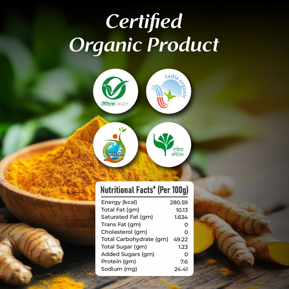 Organic Turmeric powder is a bright yellow-orange spice derived from the rhizomes (underground stems) of the turmeric plant, scientifically known as Curcuma longa. It has been used for thousands of years in traditional medicine and culinary practices.This natural pigment, known as curcumin, is responsible for both the color and many of turmeric's health benefits.It is a key ingredient in curry powders and curry pastes, imparting both color and flavor to dishes. Turmeric is used in vegetable stir-fries, rice dishes, lentil soups, stews, marinades, sauces, and more. It can also be added to smoothies, teas, and other beverages for its health benefits.Organic Turmeric is renowned for its potential health-promoting properties. Curcumin, the active compound in turmeric, has antioxidant and anti-inflammatory properties, which may help reduce inflammation, support joint health, and protect against chronic diseases.Organic Turmeric has been used in traditional medicine systems like Ayurveda for its purported medicinal benefits, including digestive health, wound healing, and immune support.